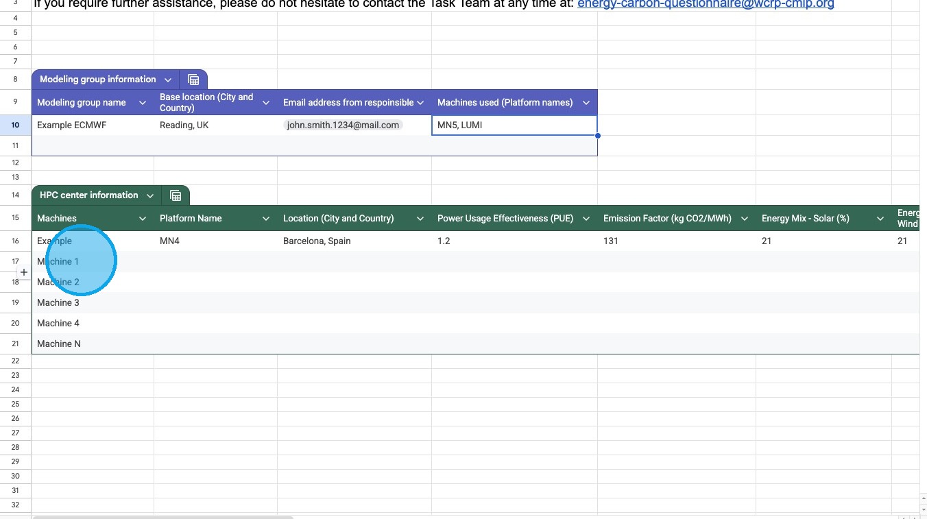 For each machine: location, PUE, emission factor, energy mix %, source